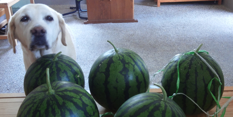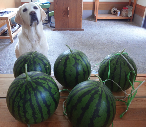 毎夏に一日だけ(それも早朝から9時ごろまで)近くの住宅地の空き地に牛窓のスイカ・カボチャ・冬瓜が売りに来られる。 今年はいつもお世話になっている散髪屋さんとYさんに差し上げる分も含めて5個も買ってしまった。 我が家は大のスイカ好き!!花ちゃんたった今冷蔵庫に入れたから晩まで待っててね。 (花かあちゃん)