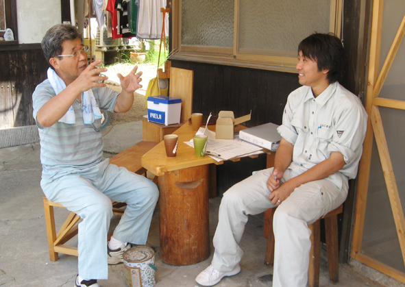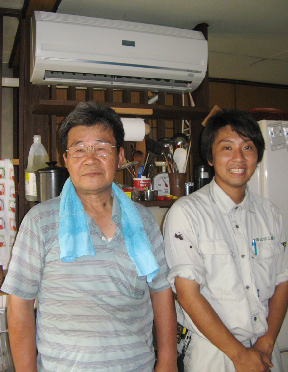 エアコン嫌いの私がこの頃、家電量販店のチラシを眺めることが多くなった。 実は昨夏から・・・。 裏のアパートのリフォームで余りそうな中古エアコンどうなるのかな?でもゼイタクは敵だ!よね。 それが今日、工務店Oさん(オニイチャン)と電気屋Tさん(オジサン)と花とうちゃんの 「余ったエアコン、お家につけられたらいいじゃないですかぁ」 の大合唱 に心が揺らいだ。 Tさんにいたっては 「たまたまエアコンの取り付け道具一式を積んでるんですよ!今日なら取り付けられますよぉ~」 と甘い囁き。 そうしてこうして軒下に転がしてあったエアコンは我が家の台所の住人となった。 ああシアワセ~!極楽極楽! 取り付け工事が長引いて 3じかんギャラリーを臨時休業してしまったぁ・・・。 (花かあちゃん)