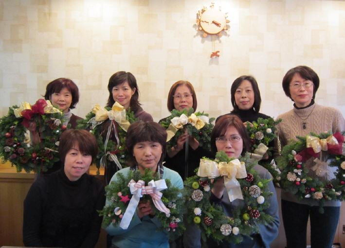 この講座も今年で4年目ですが、今日ほど制作風景を眺めて面白かったことはありません。 お若い二人のママさんは 「今年はこれでいこう~」 とあらかじめイメージして来られ黙々制作、もうちょい年上の4人グループさん (花葉初参加) は個性派揃いで北海道の向日葵畑ほどお話の花を咲かせます・・・まるで漫才! 今日はリースの標本と言って良いくらい6人6様のクリスマスリースが出来上がりました。 ホント皆さん楽しそうで・・・そのあと岡山大学学祭に遊びに行ってしまいました。