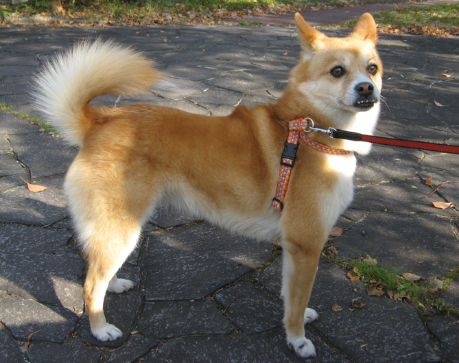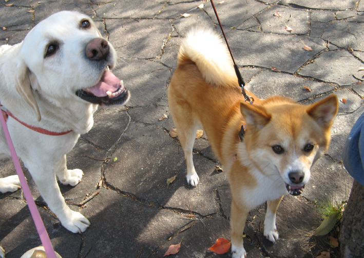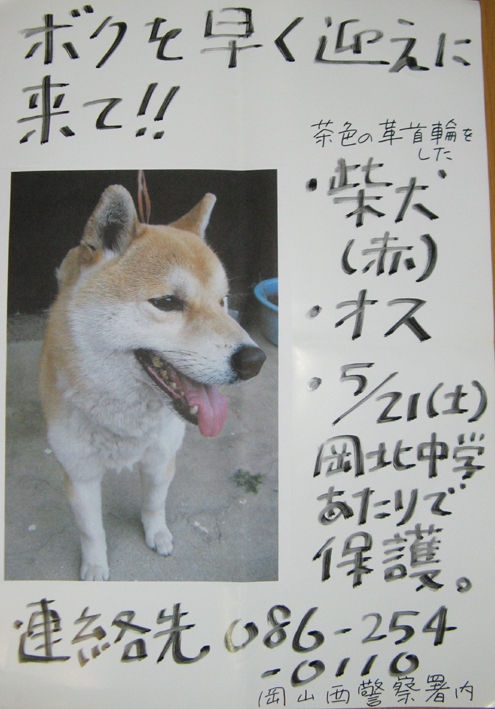 あのコはどこのコ?こんな夕暮れぇ~♫ 付いてきちゃったんですよね、花チンに柴犬(赤系・♂)が。 近所を連れて回って 「このコに見覚えないですかぁ?」 って聞き込みしたけど、2~3日前ミニバイクの人に 「柴犬見かけませんでした?」 と声を掛けられた人に出会って 『ぐぁ(が)』、どこの誰とも聞いてないそうで手の打ちようがないですわ。 とうとう手製ポスター作戦! 届けが出てないか交番にお訊ねしたところ5、6キロ離れた街で2~3日前柴犬がいなくなったとか、でもち~と遠過ぎるなぁ、イヌ違いかも?? 拾得物ということで夜遅く管轄の警察署に移送されていきました。 早く飼い主さん出てきてぇ~待ってるよぉ。 (花かあちゃん)