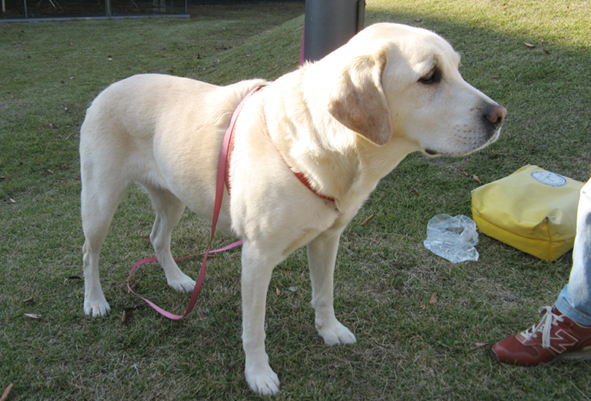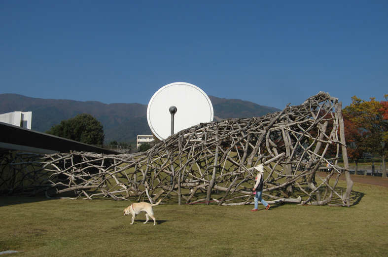 花チンは玄さんの流木作品 「奈義の耳」 を鑑賞しながら芝生で留守番しててっ!と言われても不安そう・・・。 だって父ちゃん母ちゃん頭に変な被り物して目隠しして (母ちゃんはそれに眼鏡をかけて??) 皆 (総勢20名くらいでしょうか?) で手をつないで美術館の中に消えて行ったんだもの。 ダイジョーブかなぁ??