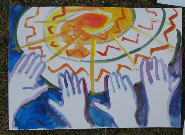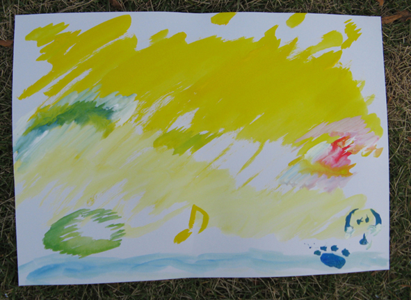どのくらい歩いたでしょう?・・・皆手をつないだまま目隠ししたまま出発地点に戻ってやっと目隠しをとって、この体験を通し見えたこと・感じた印象を赤・青・黄の3原色と白とで絵を描きます。 右の絵に花チンも参加してるのわかります?