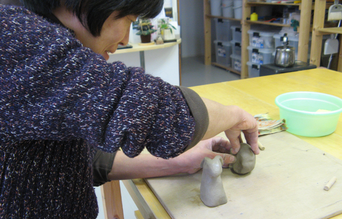 「何か作っていきませんか?10分もあったら出来ますよぉ~」 と宏樹先生ジョーダンでしょ?ココロの準備というもんが…。 数年前の 『シーサー作り』 は瓦と漆喰だから、純陶芸体験は中学校勤務以来だから20数年ぶり?? 花とうちゃんはグイ飲み、私はウサギの置物つくりましたよ。 釉薬かけて焼きあげて年内に送ってくださるそうです、待ち遠しいなあ…。 今日はホント楽しかった! Ki:Kiさん、これからもどうぞよろしくお願いいたします。