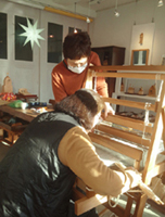 Mさん(写真左)の第2作目はタンポポのような黄色のシルク糸の繊細なショール、そっと寄せるように織っています。 「ガンバって織っちゃうわ~」と5月は3週連続(土曜日)受講予定。 Nさん(写真右)はお知り合いから頂いた織機を使いこなせるように、まずはテーブルセンターからスタート。 織経験者のなのですぐに勘を取り戻し丁寧に織り進めています。