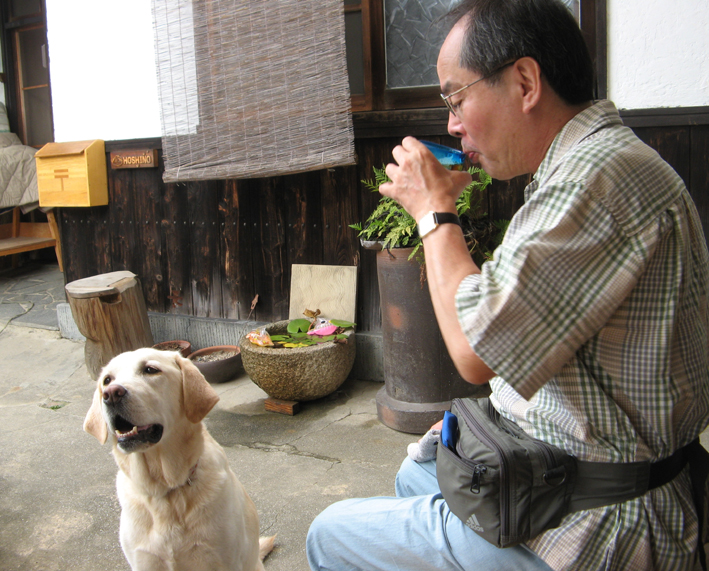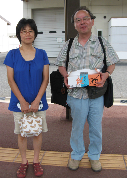 翌朝ホテルまで迎えに行き自宅に来て貰いました。 築120年の我家・オイラの工房・ギャラリー花葉などの説明やら見学やらでアッという間にお昼・・・そうだ、そうだ!岡山に来たら 「ぶっかけうどん」。 駆け足でしたが最後に岡山空港でパチリ。 お互い年は取ったが、会うと気持が子供のまま変わっていなかったのが不思議ですね。 (花おやじ)