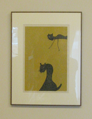 おざぶベンチにちょうどピッタリ。それから以前お買い上げいただいた保手浜さんの版画「ヒョウ」個性的な絵だけどここにピッタリ。さぁすが~! 随分話が弾んだみたいで私お外で凍っちゃってたよ。今度から寒い日は車の中に居させて!(花談)
