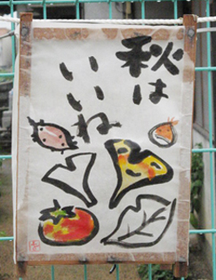 地域に住む子供の減少に伴って書き手が少なくなった秋祭のボンボリ。 花祖母ちゃんが頑張って「書」で参加しているが今年は花かあちゃんも協力…。 当日25日(土)は京阪神に出掛けるので前もって半紙に絵を描くことにした。 灯がともった所は見られなかったが翌日の午後記念撮影に行ってきた。