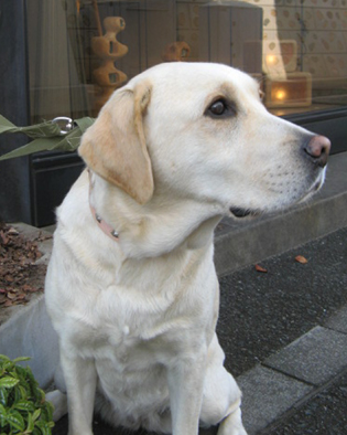 ワタチもワタチも~とくっついてきた花チン、ここ倉敷のギャラリー前でも看板犬。 通りがかる人たちが可愛がってくれました。 倉敷来てよかったね。 (花かあちゃん)