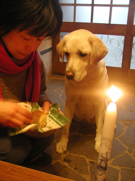 花とうちゃんの帰宅を待って、オランダ土産(約20年近く前…)のキャンドルに灯をともし、花チンお誕生日会の始まり始まり~! 5歳のお祝ケーキは「バナナ&ブルーベリーシフォンケーキ」。 卵を泡立てたりオーブンレンジで焼いてる時から花ソワソワ。 そりゃ待ち遠しいよね~。 気持ちよく食べてくれた。 ねえ花チン、お願いがあるんだけど・・・あんまり急いで年取らないでよ。 これからもいっぱい思い出を作ろう。 確定申告無事終了したら、「3じかんギャラリー」付き合ってよぉ。 アンタは花葉の看板娘なんだから~。 (花かあちゃん)