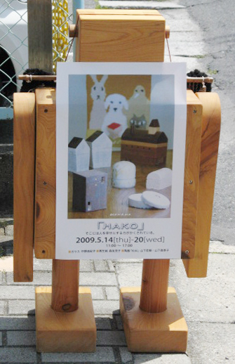 今日から始まった「HAKO」展。 花葉の中を風が通り抜けて行きます。 お恥ずかしい乍らDM用に作った布ポスターが皆さんに「いっらっしゃ~い!」、主役の花チンは大人しくお留守番です。(花かあちゃん)