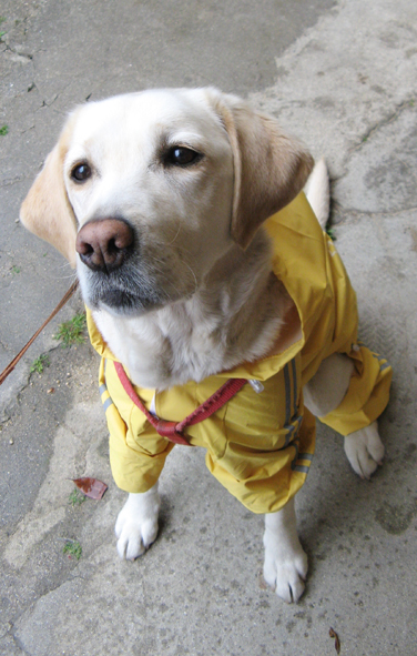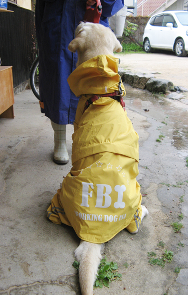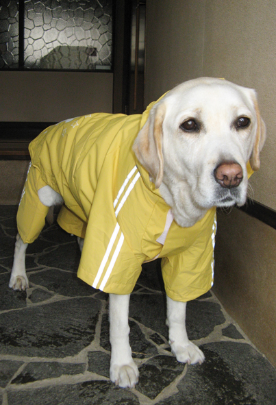 今日はおニューのレインコートだよぉ。 通販で『ラブラドール用』を取り寄せたらキュークツで、ひと回りデカイ『ゴールデンレトリバー用』を買ったらピッタリ。 元気の出るイエロー、どぉ?似合ってる? (花チン)