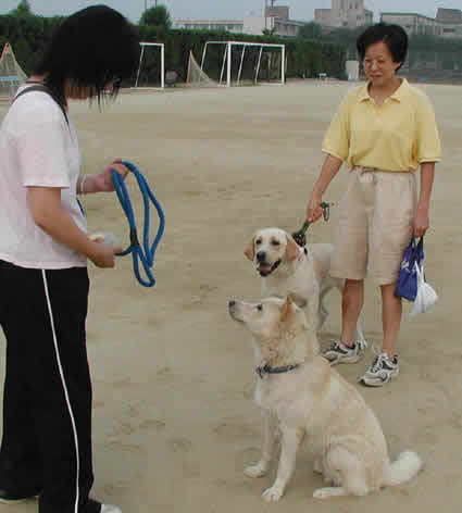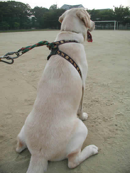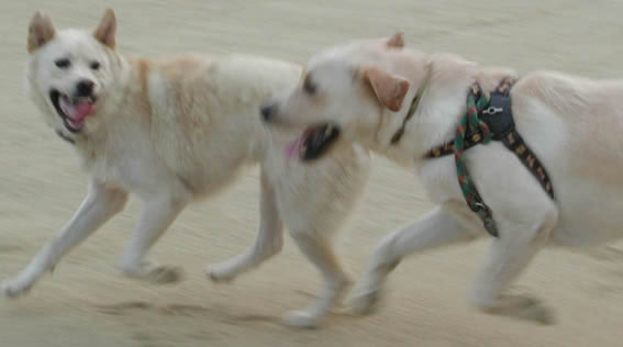 大豆ちゃんとの約束があるから寝坊なんて出来ないっ!暗いうちから父ちゃん母ちゃん叩き起こしてっと。急がなくっちゃ!(この時、やっと陽が昇り始めたところ)いつものグラウンドに到着。あれっ?来てないよ。キョロキョロ、あっちの入り口こっちの入り口じっと見つめて。 来た来た来たァ~!「待った?」「ううん、今来たとこ!」(耳がピンと立った方が大豆ちゃん)同時にリードから離してもらって、ヨーイドン!走るゥ走るゥ俺たち~。花ちゃんの方が少し体力では勝ってるかな?でも大豆ちゃんも負けじと策を練る。