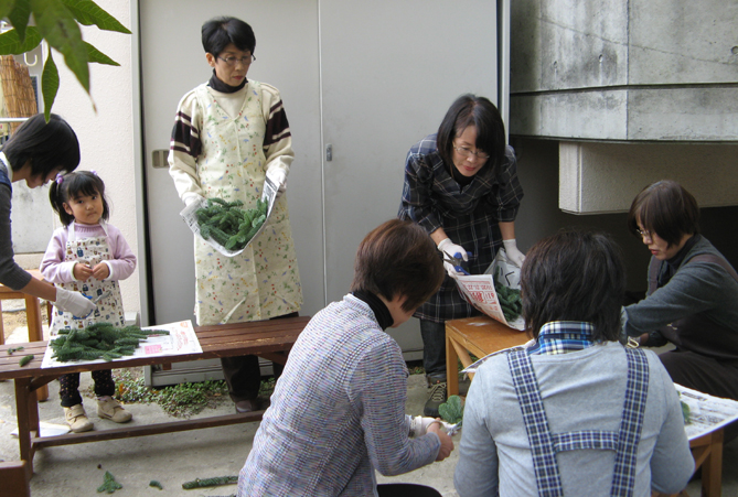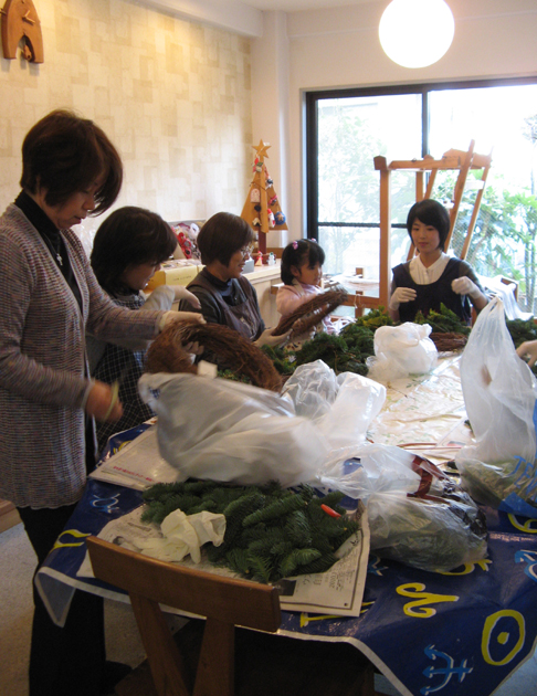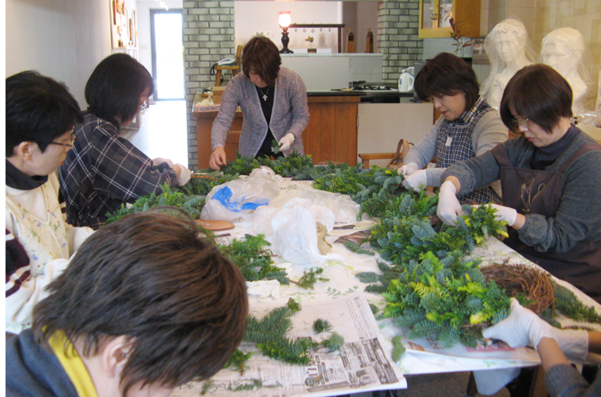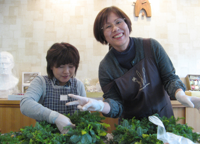 お次はワイヤーを使って切り分けた小枝をベースに固定していく作業。 ここからは皆さん無言…真剣になっています。 やっぱり蟹を食べる時のように 「・・・・・」 お好みのオーナメントやリボンを選んだりする頃には余裕が出てきて笑顔が見られるんですけどね。