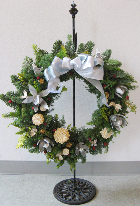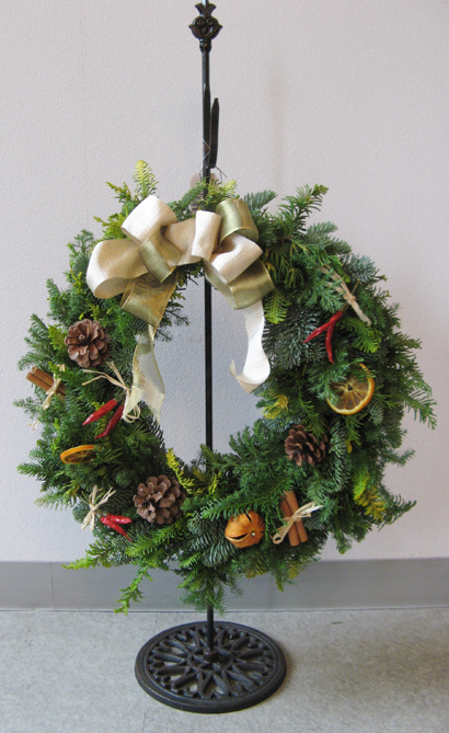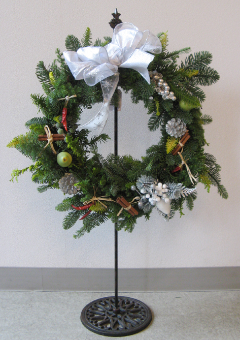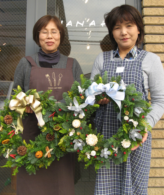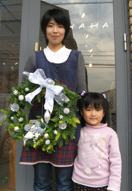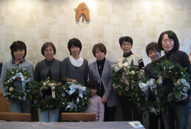 いいのが出来たでしょ~。 ちっちゃいお嬢さん(4歳)を連れて参加されたSさんの作品は清楚で若々しい感じ。 Iさんのクレッセント型リースは初参加とは思えない洗練された上品さが漂っています。 「今日は個性的な作品揃いでした。完成して喜ぶ皆さんの笑顔がとても嬉しいわ~」 と先生。