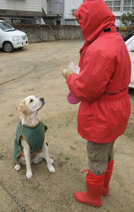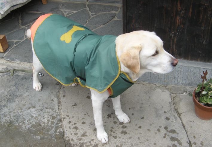 今日はワタチの7歳のお誕生日、朝散歩に横なぶりの雪が降ったんだよぉ。 こんな日はダウンジャケット着せられてその上からレインコート着せられて完全防備でしょ~。 母ちゃんまるで赤頭巾オバサン! ワタチたちの散歩って目立つんだよね~ちょっと恥ずかしい。