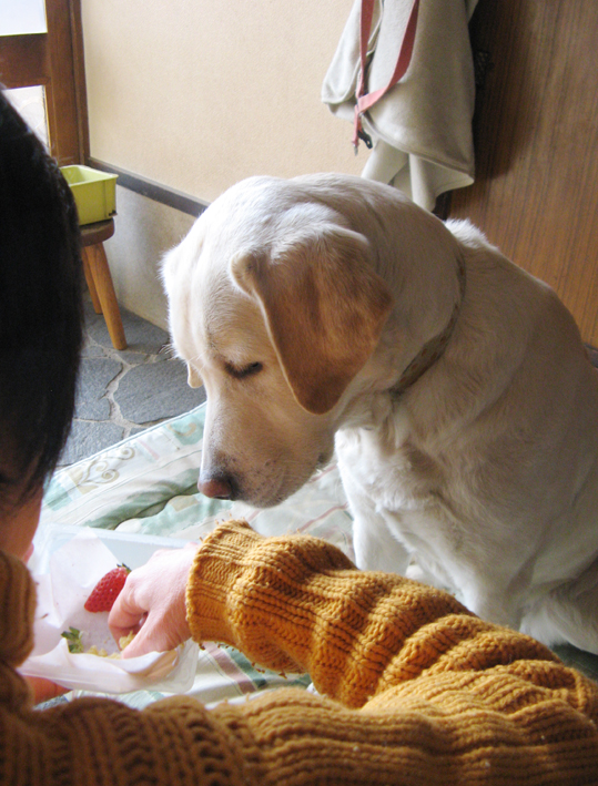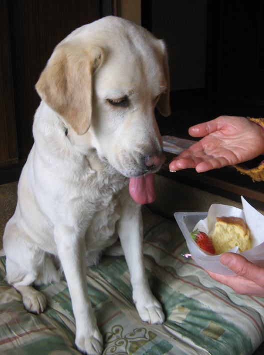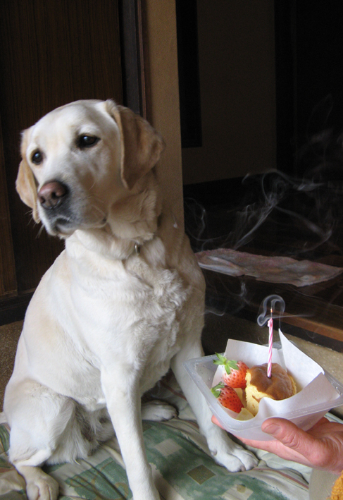 今年の手作りシフォンケーキはチーズ味、イチゴとバナナいっぱいで、ロウソクも立ててあったよ。 「フーと消してっ!」 と母ちゃん囃すけど出来ないよぉー。 今年もいっぱい遊びに連れてってね! (花チン)