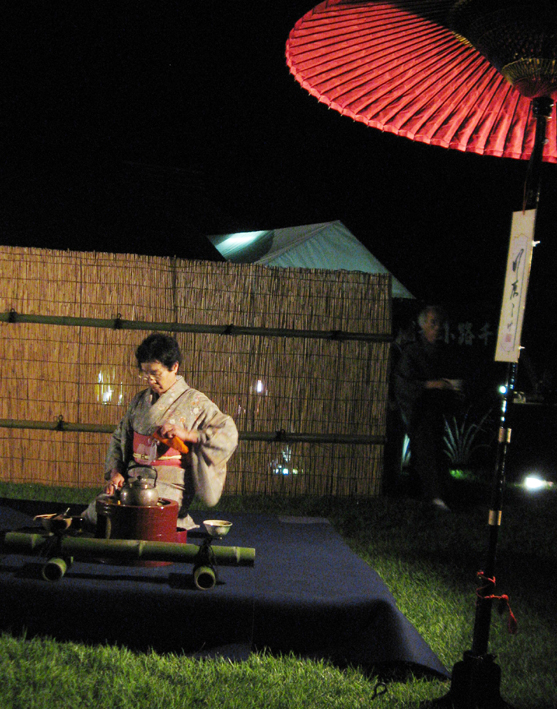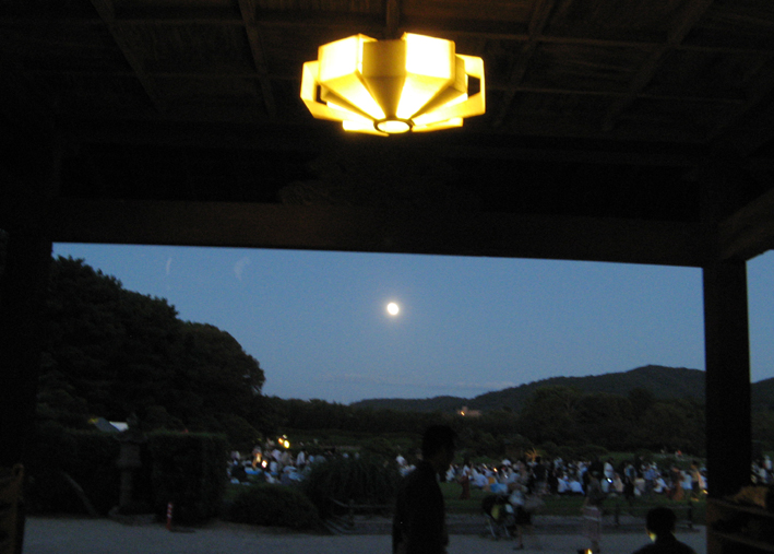 昨夜、後楽園の名月茶会に行って来た。 毎年この日は早めに花チンのお散歩をすませゴハンをやり、自転車に空気を入れ (ここまで読んで、え”っ?飲酒運転?なんて硬いことは言わないでね) スーパーでちょっとゼイタクなお寿司とビールを買う。 まずは花とうちゃんとふたり野立てを楽しんで・・・。 ワタシ、この武者小路流の席主のオジサンのファンなんだぁ、眼光鋭くて只者でない感じで。