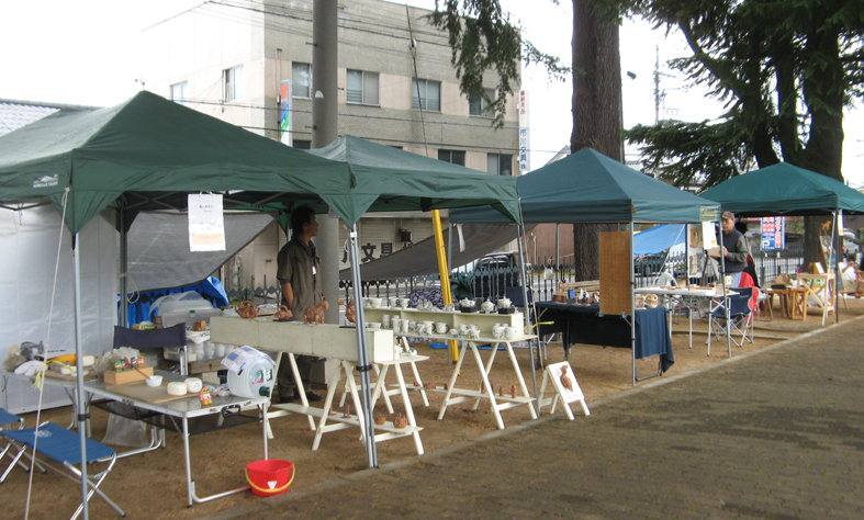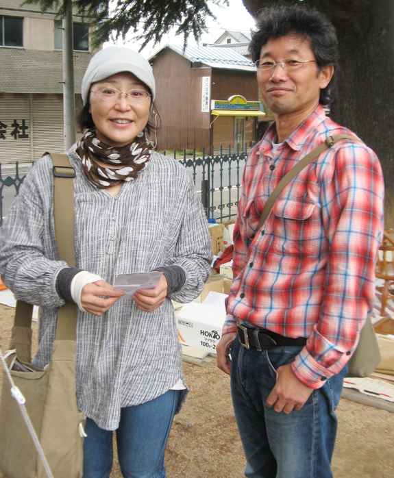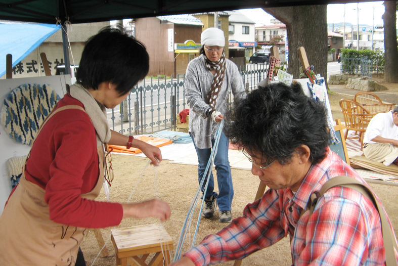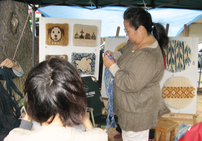 1日目は午後の部をやってるうちに日が暮れてしまい、あたりを見渡して私のテント以外誰もいねー「日も暮れちゃったので明朝補習授業しましょうか?」 でお開きにしました。 下の写真の女性おふた方は私の初めての生徒さんたち。 続きはおうちで・・・とお持ち帰りいただきましたが、今夜あたり織っているかも?! 報告レポートはまだまだつづく・・・。 (花かあちゃん)