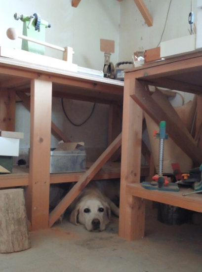リフォーム工事の始まった8月19日からワタチはココ(花とうちゃんの工房)で寝てるんだよぉ。 四角いお部屋を丸く掃くタイプの花とうちゃんはそれなりに環境美化に努めてくれるけど、作業台の下までは手が回らないんだなぁ。 ゴロゴロって雷ドンが鳴って潜り込んだら、レゲエシンガーのスダレ頭のように蜘蛛の巣が頭からぶら下がって花かあちゃんに呆れられたんだ。 でも狭いところはミョーに落ち着くんだなぁ~。 〈花チン談)