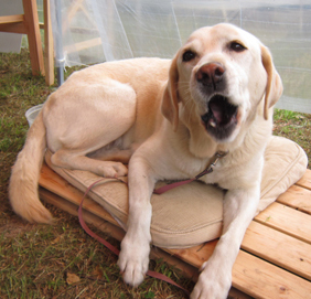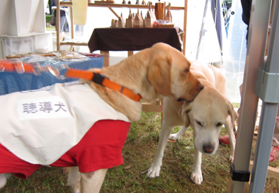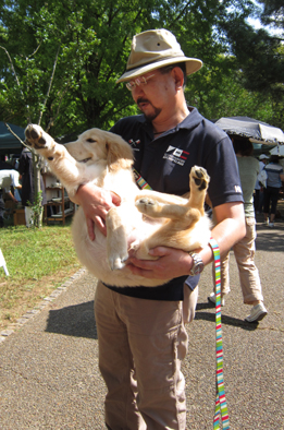 ここではいろんなワンちゃんと出会えます。 聴導犬のジュン君(ラブラドール:4歳♂)は花チンとご挨拶してついついお仕事を忘れてましたよ。 飼い主さん了解の下ならこんなことあってもいいかな? 右写真のゴールデン(1歳未満♂)は手に負えない悪児らしいですが、車酔い直後でシオらしく里親さんに抱っこされてました。 飼い主さん募集中だそうです!!