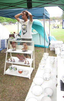 10月5・6日の2日間、丹波の年輪の里で開催のクラフトフェアに参加。 ここは全国で数少ない 『会場に宿泊用テントを張ってもいいフェア』 で、キャンプ好きな作り手さんに大人気です。 昨年は台風の襲来で初めてのテント村体験を逃したので、今年こそはと意気込んで来ました! 到着が日暮れ時になって、愛すべき隣人たち 山本テツヒコ夫妻がちゃちゃちゃ~っと組み立ててくれ、助かりました。 門限がなく、無駄にお金を使うこともなく(何せ公園ですから・・・)夜更けまでたっぷり友と語り明かしましたよ。 Ki:Ki工房さん、ぜひ来年こそテント買って合流しましょ!!(ただしテント内をピョンピョンするアマガエルにビックリしないでくださいね。)