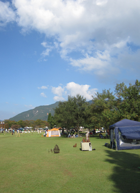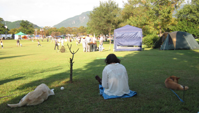 花チンは夜の交流会のアトラクション演奏にビビって植え込みの中にダイビング、自分のテントにまっしぐら・・・。 また調子に乗り過ぎ、読書中のジュリさん(お隣さん) の肩にお手をしていて、ブラウスに穴を開けたり。 うわっ、ごめんね! (花かあちゃん)