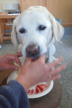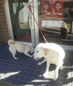 〈左写真〉そのあと仲良しのヒロちゃん(豆柴)のところに寄っておやつをもらって機嫌は直ったかな?