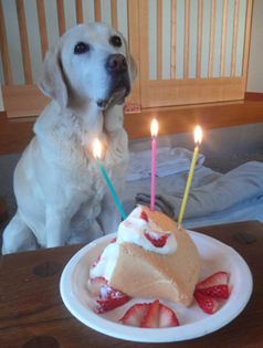 花ちゃんに甘さ控えめ豆乳シフォンケーキつくったよ。13才だけどロウソクは3本ね。