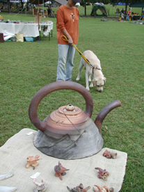 久しぶり、ロングドライブは・・・。車で5時間かけて丹波ってとこに行ったんだ。途中電気工事してたり迷ったりしたよ。とうちゃんは材木端材を買いに、かあちゃんは作家さん発掘に・・・。行く前はワンちゃんお断りの公園だったらどうしようと心配してたけど、ここはワンちゃんのフリスビー大会も開かれるらしくて大手を振ってOK!お友達もいっぱいいたよ~。陶器やガラス、木工品、染織品といろんな作家さんのテントが150ばかり。面白かったのはすっごく大きな土瓶。ぶんぶく茶釜に出てきそうだった。気持ちのいい公園だったなあ。走り回れたらどんなにいいだろう。今晩はぐっすり眠れそう。(花談)