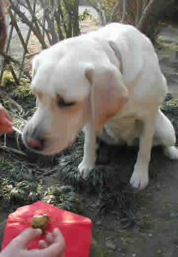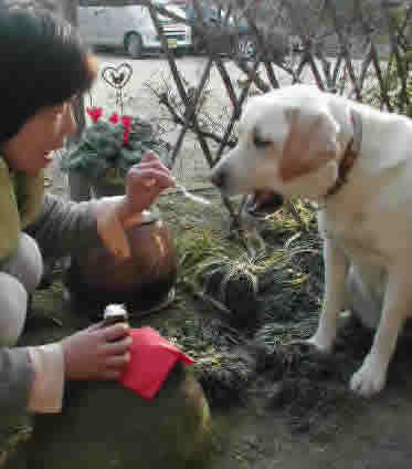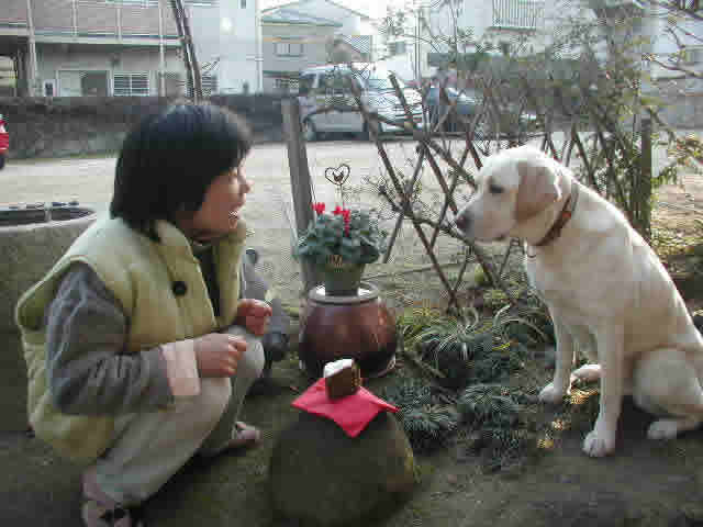 いいお天気。庭の花たちもいっせいに花ちゃんのお誕生日をお祝いしているよ。花ちゃんをタオルにくるんで抱いて帰ったのがまるで昨日のことのようだけど、すっかり大きくなったね。今朝のお散歩で久々に茶ラブのミーフ君(茶ラブ・もうすぐ2才)と元気なご挨拶ができて良かったね。さあ3時!シフォンケーキ(抹茶ベースに小豆入り)焼き上がったから食べよう。お味はいかが?いつまでも元気な花ちゃんでいてくださいね。(花かあちゃん)