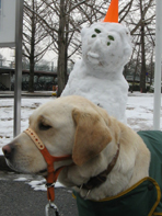 お天気の悪い日のお散歩は誰にも会えません。それでも花は待ってるんです。 この冬、生まれて初めて雪ダルマに会いました。大寒の日の翌日あちこちにいた雪ダルマにワンワン声をかけたけど、応答ナシ。日ごと小さくなって消えてしまったと思ったらこの雪でまたあちらこちらに出現! 手足ちゃっぷいちゃっぷいだろうに、やっぱりお散歩は楽しいようです。 お手製の口輪(ジェントルリーダー)は噛むからではなくエレガンスに歩くためです。早く卒業できるといいね。(花かあちゃん)