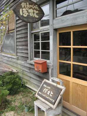 昼前、ワカバヤシさんの案内で車で山を下って鳥取智頭町へ。 ゆるゆるした時間の流れる「野原のCAFE ぽすと」で自然食ランチをいただくことに・・・。
