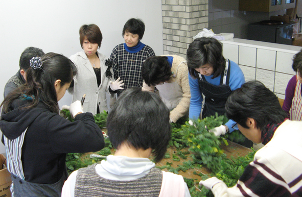 リース作りは初めてという生徒さん達(私も含めて8名)が揃いました。 まずはオレゴン産の樅(もみ)、国産スギ、ヒバの3種の枝をばらすことから始まりました。 まるで蟹を食べているのかと思われるくらい皆さん黙々と切っています。 「・・・・・」。