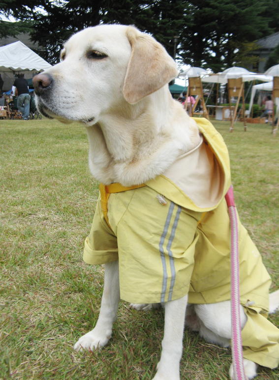 あがたの森公園は松本駅からまっすぐ東の市民憩いの文化的ゾーン。 岡山ではめったにないことにワンコOKなんですよね。 会場に向う途中は大降りの雨だったのに、搬入時には雨も上がって薄曇り、ワークショップに使う大切なカードがぶっ飛ぶ強風でしたけどね。 興奮度マックスの私は雨が上がったにも気づかず合羽ズボンを脱がないまま、クマのようにテント内をウロウロ。 うっかりして花チンのレインコートだって丸1日脱がしてやってなかった~ゴメンネ。